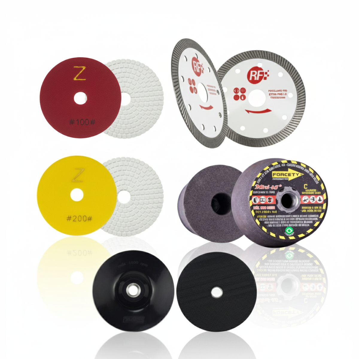 Este é um kit focado na sequência de polimento diamantado. Ele começa com grãos mais grossos (#100 e #200) para remover imperfeições e marcas de corte, usa o Rebolo Copo Cônico para dar forma e desbastar cantos, e finaliza com o Disco Extra Fino para dar o brilho espelhado à peça. O Suporte é a peça fundamental que permite o uso das lixas na máquina.
